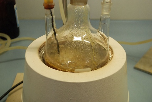 – Реакционная установка собрана из стандартного колбонагревателя со стеклянной реакционной колбой, обратного холодильника, соединенного с термостатом для задания режимов фракционирования, а также прямого холодильника и сосуда для сбора широкой фракции углеводородов. В конструкцию установки также входят: устройство для подачи азота в реакционную колбу и две термопары, – говорит Олег Кузьменко.