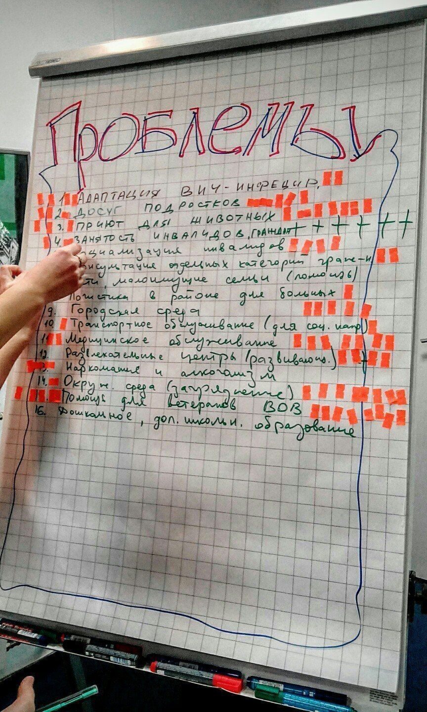 – Сначала каждый записал проблемы, которые он видит, затем мы обсудили их в своей подгруппе и выбрали наиболее значимые, – рассказывает участница Школы Екатерина. – Таким образом от всех команд поступило 16 проблем, которые выписали на доску, и с помощью голосования выбрали 5 – по одной на группу. Каждая команда обсуждала уже конкретно поставленную проблему. В конце занятия все группы представили появившиеся у них идеи и обменялись мнениями.
