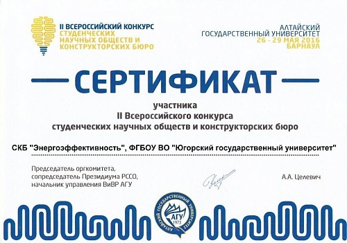 С 1 по 29 мая на базе Алтайского государственного университета (Барнаул) состоялся II Всероссийский конкурс студенческих научных обществ и конструкторских бюро. Организаторами конкурса стали: Алтайский государственный университет и Российский союз студенческих организаций. Югорский государственный университет на конкурсе представляло Студенческое конструкторское бюро «Энергоэффективность», базирующееся на кафедре энергетики Института природопользования.