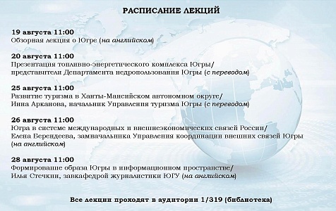 Международная летняя школа состоится при поддержке Германской службы академических обменов (DAAD). В ней примут участие 15 студентов из вузов Германии, Словакии и России. В течение двух недель они будут изучать русский язык и посещать лекции на английском языке, благодаря которым смогут получить общее представление о наиболее важных отраслях Югры: нефтегазовом комплексе, внешнеэкономической деятельности округа, бизнесе, туризме, сохранении культуры народов ханты и манси, инновационных технологиях, рациональном природопользовании, СМИ и т. д. Лекции и презентации проведут эксперты из окружных департаментов и организаций, а также преподаватели ЮГУ.