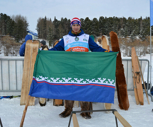 Представитель народа ханты и выпускник Югорского госуниверситета Руслан Багардаев пробежал около двух километров на охотничьих традиционных лыжах, обитых коротко остриженным оленьим мехом.