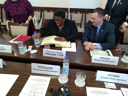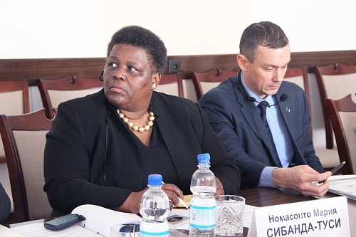 Чрезвычайный и Полномочный Посол Южно-Африканской Республики в Российской Федерации Номасонто Мария Сибанда-Туси встретилась с представителями СурГУ, ЮГУ и Обско-угорского института прикладных исследований и разработок. Встреча прошла в стенах Югорского госуниверситета. Модератором выступил заместитель губернатора Ханты-Мансийского автономного округа – Югры Всеволод Кольцов.