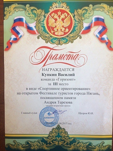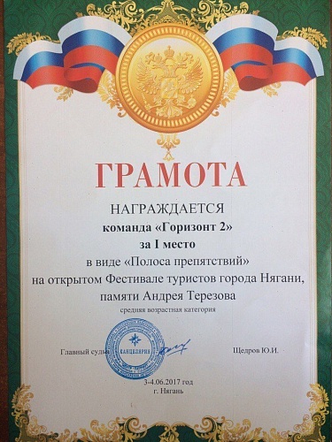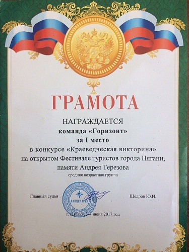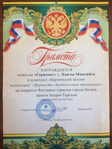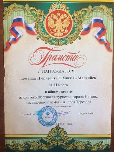 По итогу всех ступеней конкурса команда «Горизонт» заняла II место в общем зачете открытого фестиваля туристов города Нягань, посвященном памяти Андрея Терезова.