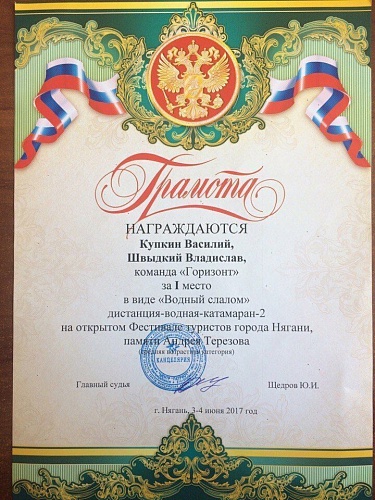 Диплом за I место в виде «Водный слалом», дистанция – водная – катамаран- 2 получили Купкин Василий и Швыдкий Владислав.