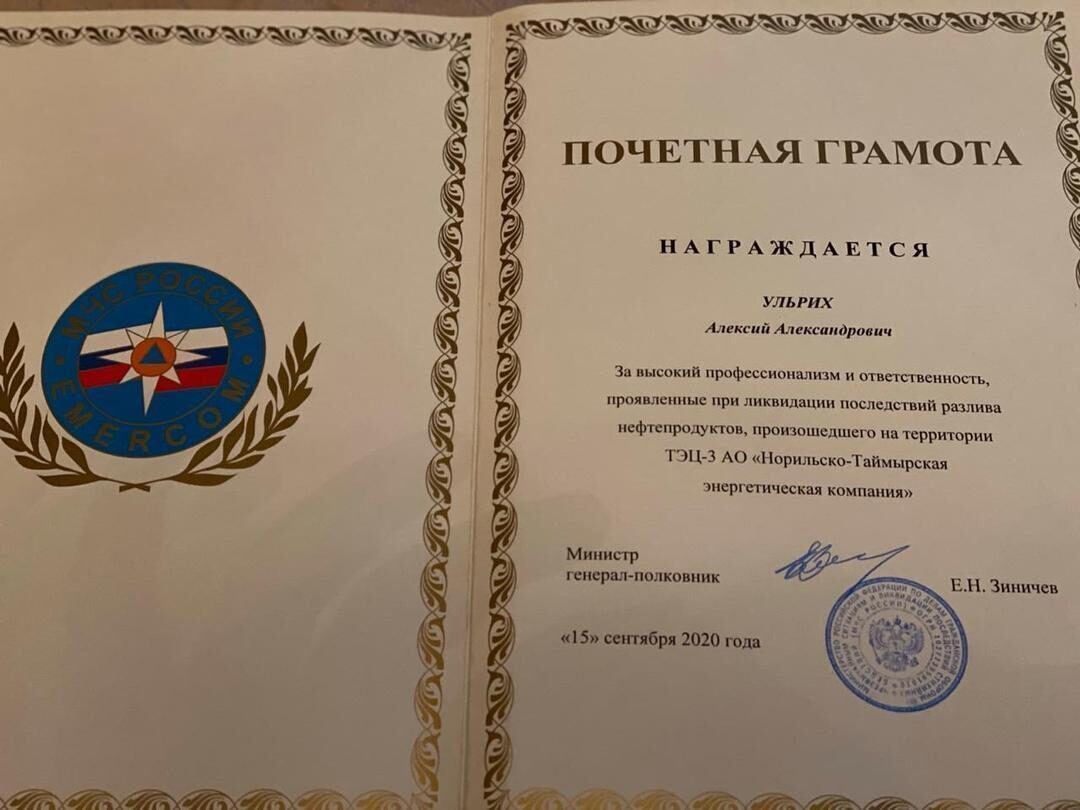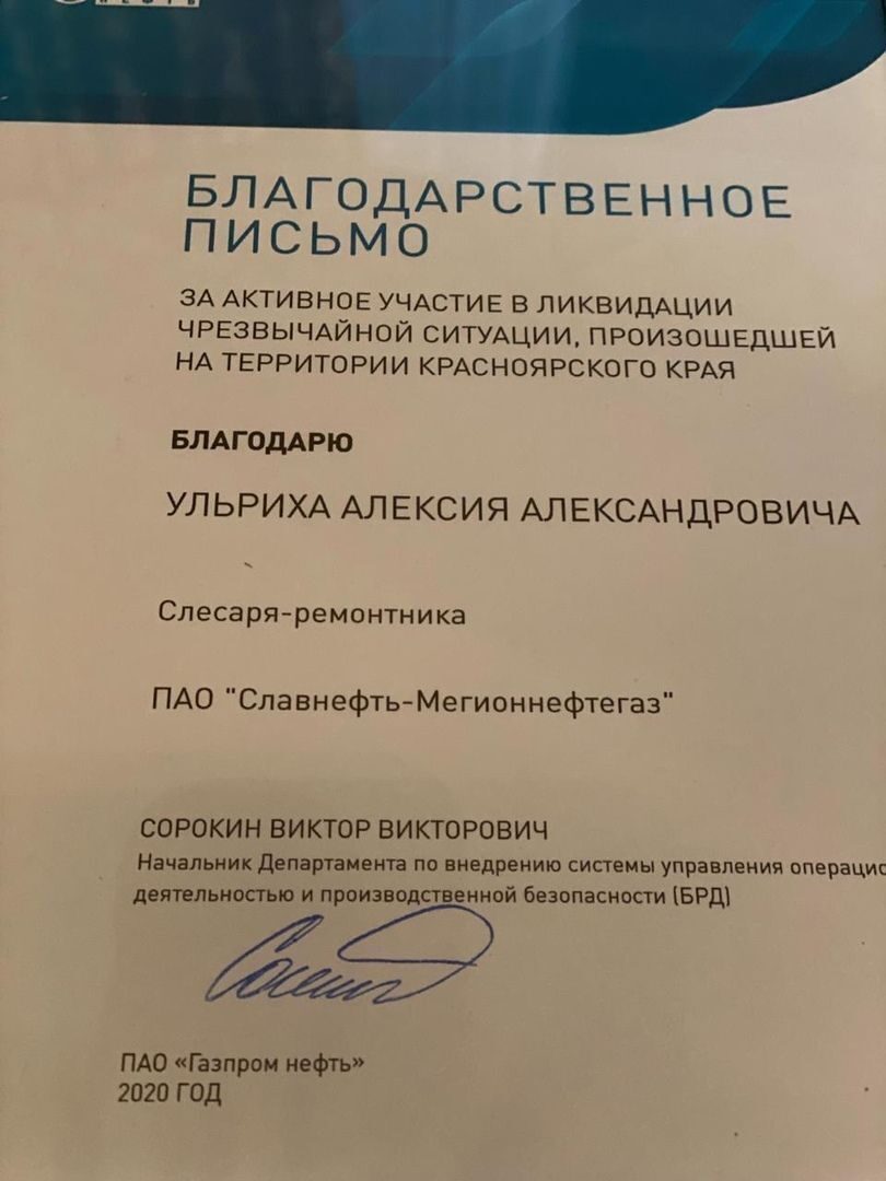 Сотрудники предприятия «Славнефть-Мегионнефтегаз» в начале июня 2020 года отправились в Норильск - в район аварии, где произошла экологическая катастрофа, чтобы восстанавливать грунт и водные ресурсы. В течение двух недель в составе аварийно-спасательного отряда «Газпром нефти» работали в сложнейших условиях Арктики. Для ликвидации последствий аварии компания экстренно командировала в Красноярский край своих лучших специалистов из Мегиона, Нижневартовска и Ханты-Мансийска. В составе команды - студент Нижневартовского нефтяного техникума Алексей Ульрих. Молодой человек работает слесарем-ремонтником в компании «Славнефть-Мегионнефтегаз».
