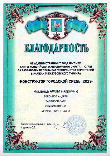 1 место в межвузовском турнире «Конструктор городской среды – 2019» заняла сборная УрГАХУ и Югорского государственного университета «AIIIUM», в состав которой вошла Полина Мокринская. Ребята защитили проект «Мемориальный комплекс Славы и Вечного огня» в Пыть-Яхе.