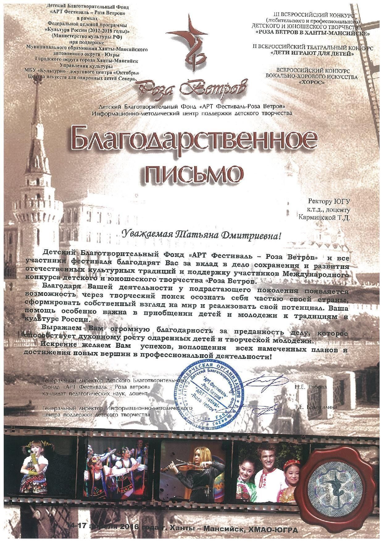 Благотворительный фонд «АРТ Фестиваль – Роза Ветров» выразил благодарность ЮГУ