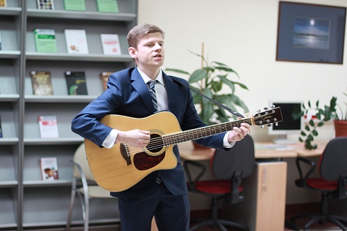 Помимо стихов на заседании «Литературного кафе» звучали песни в исполнении выпускника Югорского университета Максима Никонорова и сотрудника Константина Суровикина.