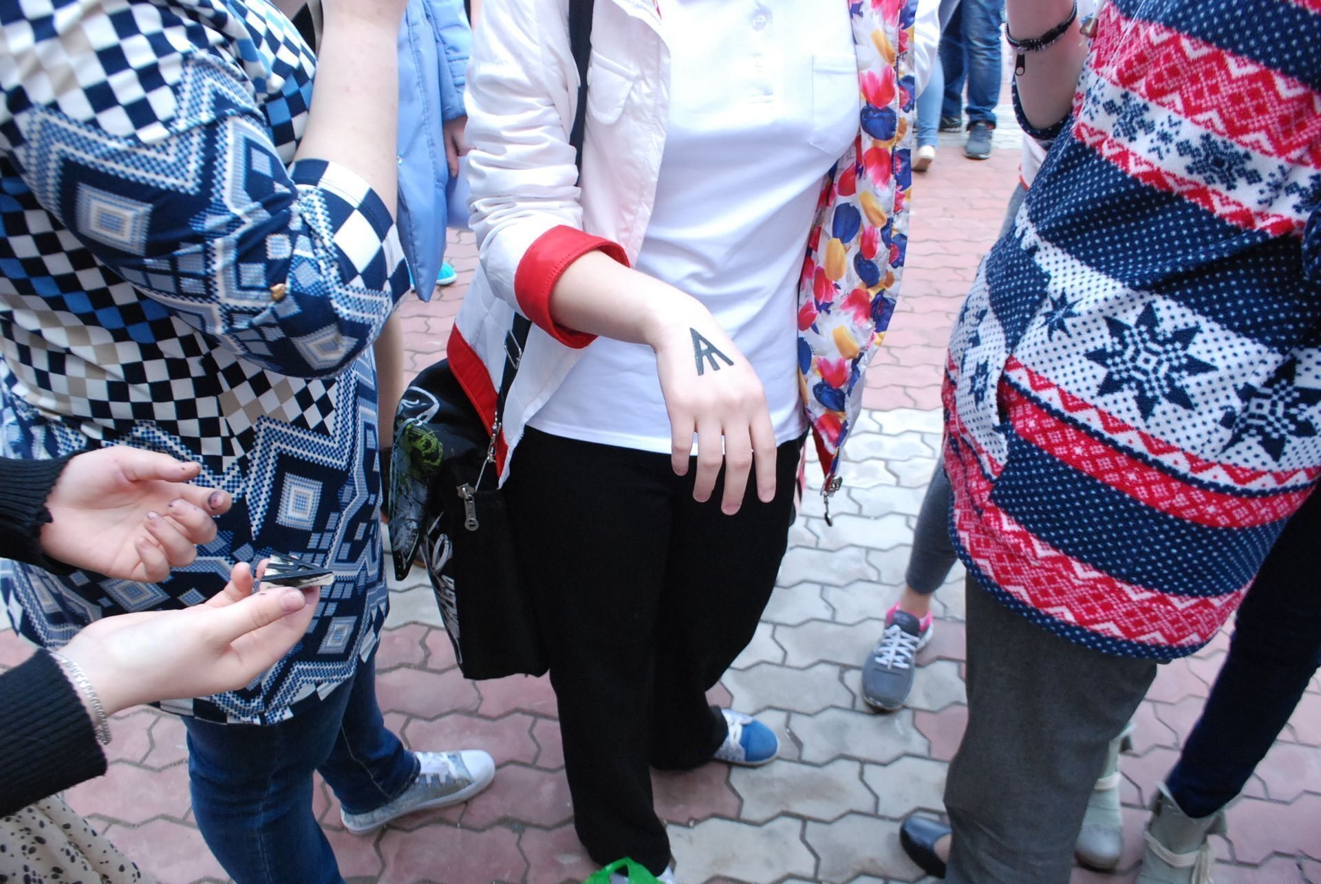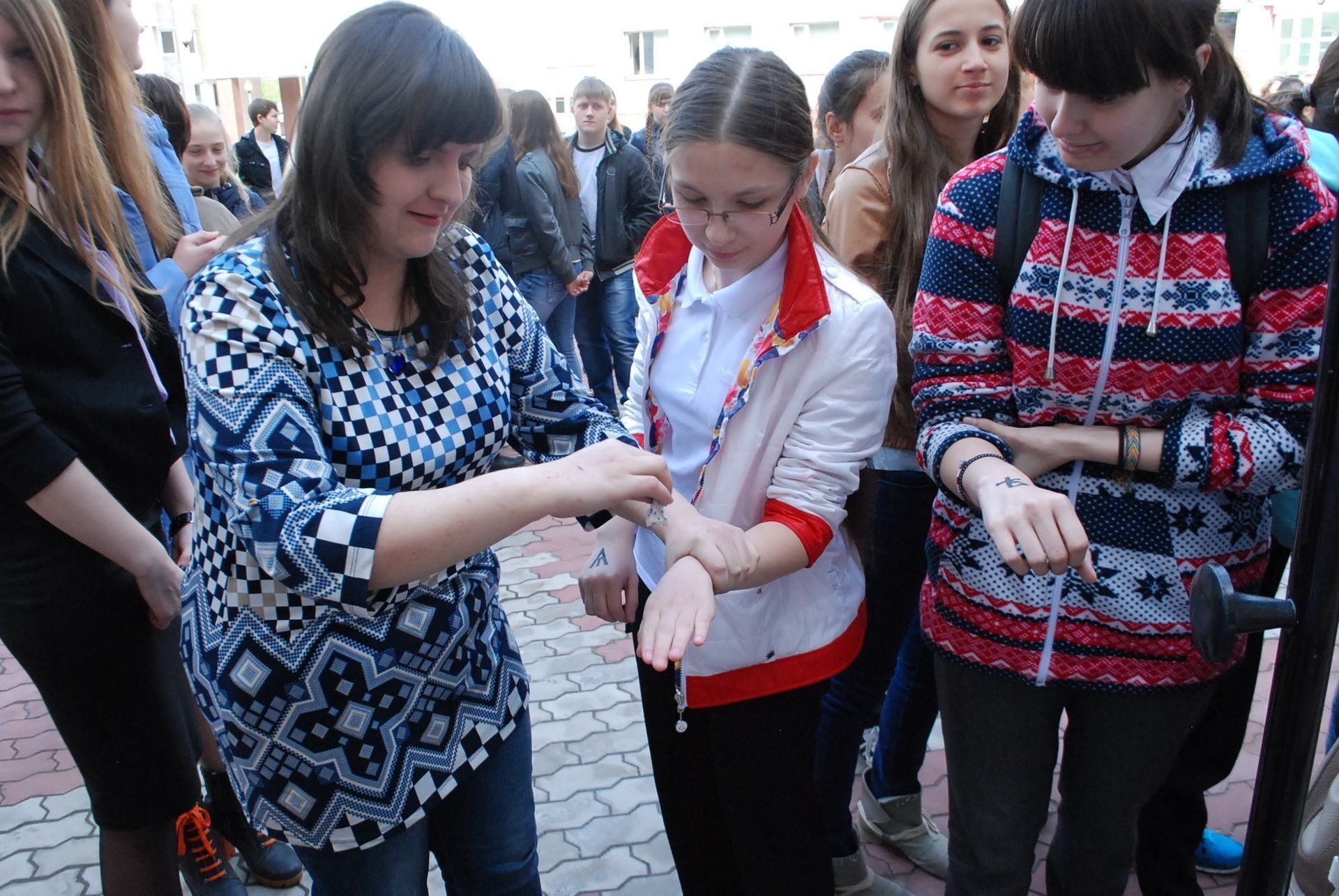 В конкурсе чтецов приняли участие не только студенты Гуманитарного института, но и студентка института менеджмента и экономики, а так же старшеклассники школы № 3, которые традиционно принимают участие в университетском празднике. Школьники запоминали буквы, придуманные Кириллом и Мефодием, а за правильное их написание получали поощрительные штампики с изображением букв на руку.