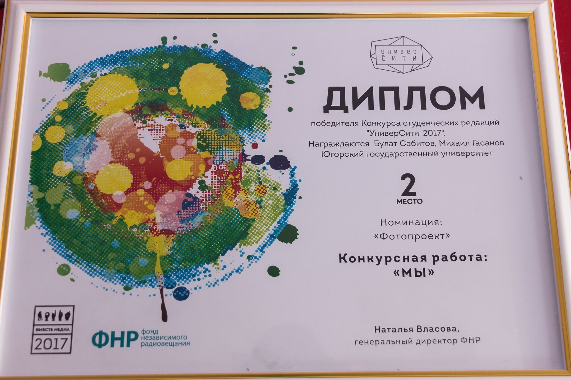 Наши студенты создали «МЫ» еще до объявления старта конкурса и искали площадку для того, чтобы продемонстрировать свой проект, до этого опубликованный только в социальных сетях. Жюри «УниверСити-2017» после предварительной оценки включило работу Булата и Михаила в список финалистов, разместив фотографии в своей галерее, а после, в финальный день фестиваля, присудило второе место. Победителем направления «Фотопроект» стал Владислав Некрасов из Новосибирска, представивший снимки под заголовком «Свет науки». Наших ребят, помимо общего зачета, выделил Никас Сафронов, отметив философский подтекст и глубину проекта «МЫ».