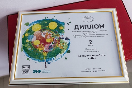 22 апреля в Москве состоялось подведение итогов конкурса «УниверСити-2017», в результате которого студенты кафедры «Журналистика» Булат Сабитов и Михаил Гасанов заняли второе место в номинации «Фотопроект» со своей работой «МЫ», а также получили специальный приз от советского и российского художника Никаса Сафронова.