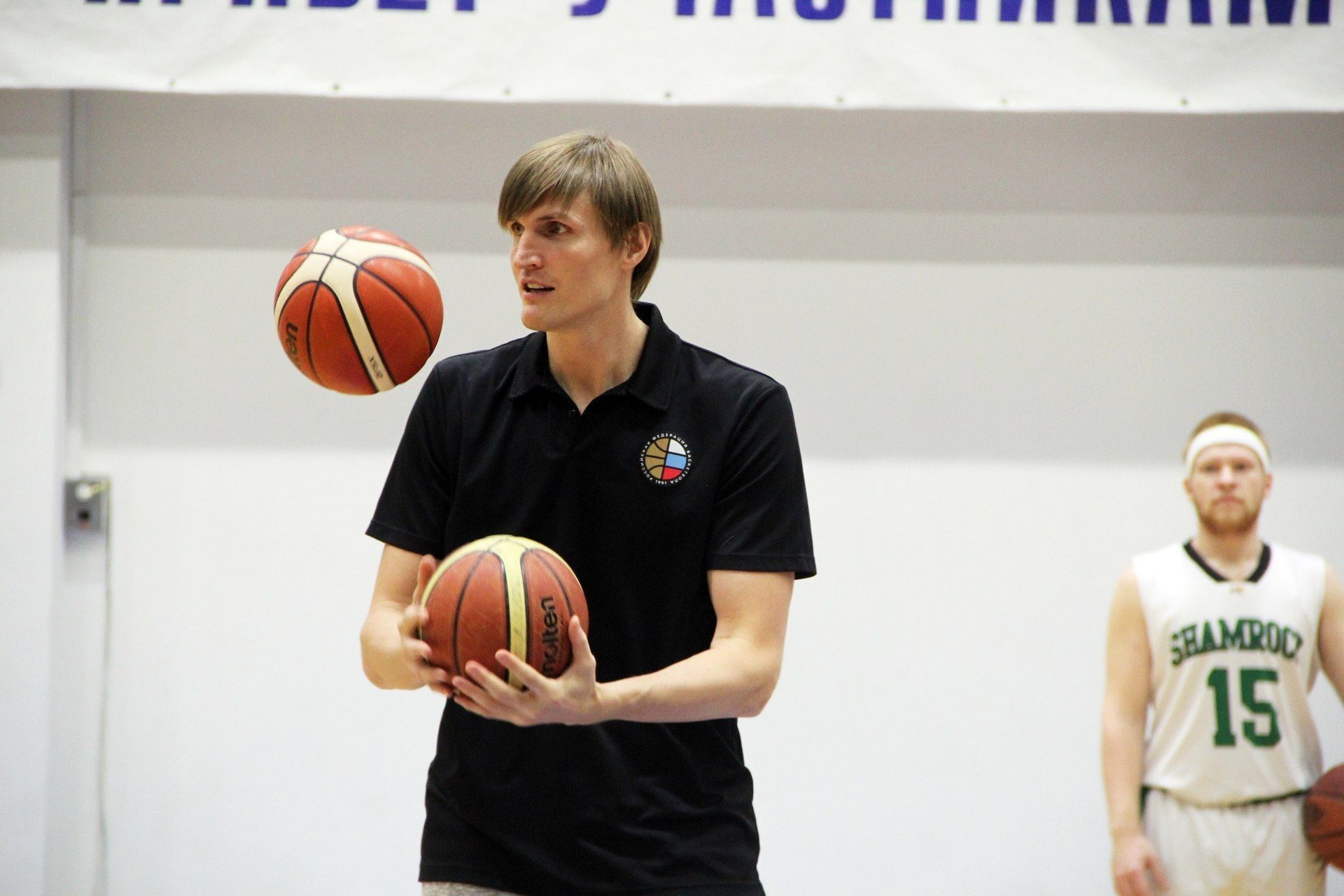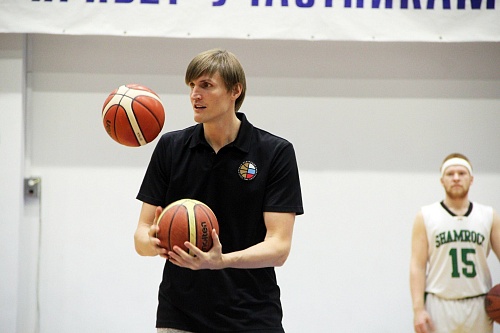 «Представьте, что мяч – это продолжение руки», – комментировал чемпион упражнения и помогал выполнить «трюки» баскетболистам дошкольного возраста. Самых смелых участников разминки Андрей приглашал в центр зала, где они под дружное одобрение зала выполняли задания. Одним из них был студент 4 курса Юридического института Валерий Кузнецов, который легко и просто он управлял двумя мячами одновременно. Оказалось, что Валера не просто баскетболист, а жонглер. И уже с детского возраста «на ты» с мячами, правда, более мелкими и легкими, чем баскетбольный. (Вес баскетбольного мяча составляет 650 граммов).