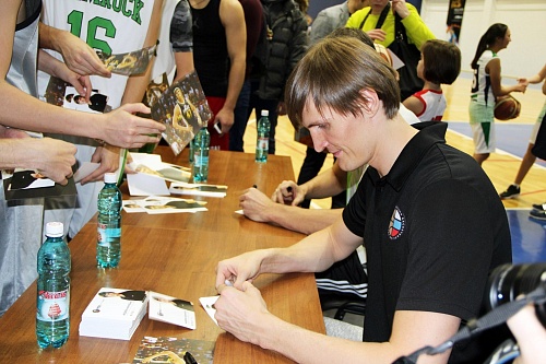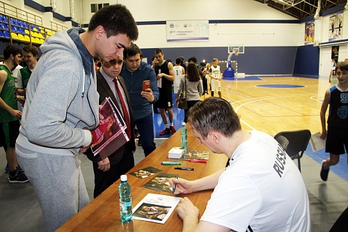 Андрей вместе со зрителями и участниками мастер-класса записали короткое видео-послание «Привет из Югры» другим городам, в которых еще только предстоит побывать спортсменам и приступил к автограф-сессии, во время которой молодежь активно фотографировалась со звездами баскетбола.