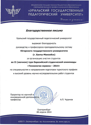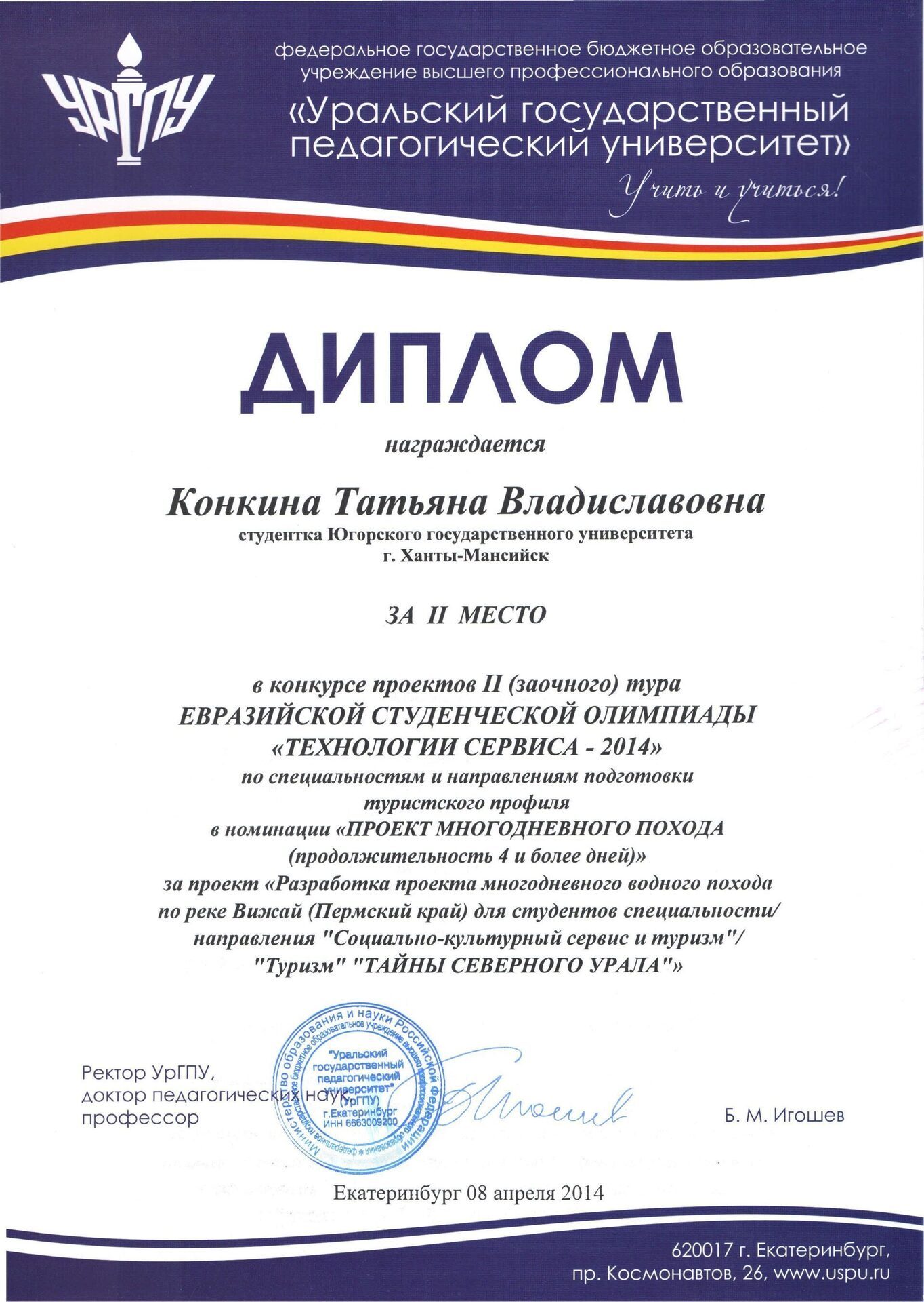 Студентка Института менеджмента и экономики ЮГУ Татьяна Конкина удостоена II места в номинации «Проект многодневного похода» на Евразийской студенческой олимпиаде «Технологии сервиса – 2014».