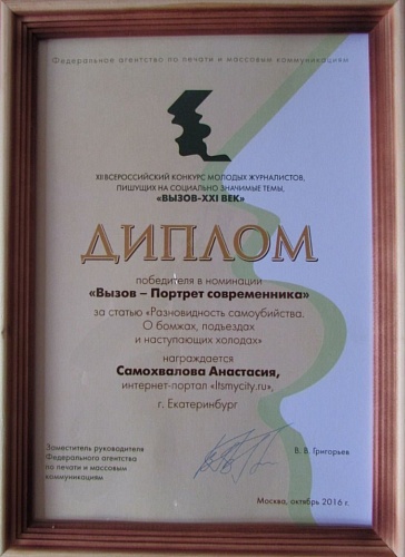 Материал Анастасии, затрагивающий социально-значимую тему бездомных людей и суровых реалиях был высоко оценен жюри в номинации «Портрет современника» в категории «Интернет».