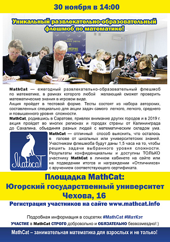 Приглашаем хантымансийцев и гостей города принять участие в VI Всероссийском образовательно-развлекательном флешмобе по математике MathCat, который состоится 30 ноября в 14:00 в 326 аудитории 4 корпуса ЮГУ.