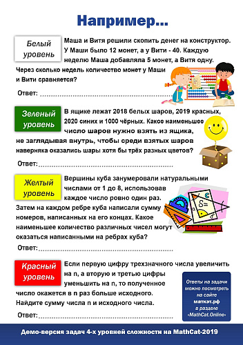 – Флешмоб проходит в письменной форме. Существует четыре уровня сложности – от белого до красного уровня. В прямом и переносном смысле. Самые легкие задания напечатаны на листках белой бумаги, далее – на зеленой, желтой и красной, – рассказывает организатор MathCat в ЮГУ доцент Института цифровой экономики Ольга Петухова. – Участники получают сразу комплект заданий всех четырех уровней и сами определяют, какой уровень заданий они будут выполнять.