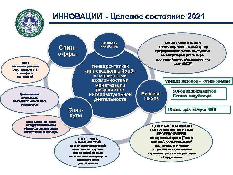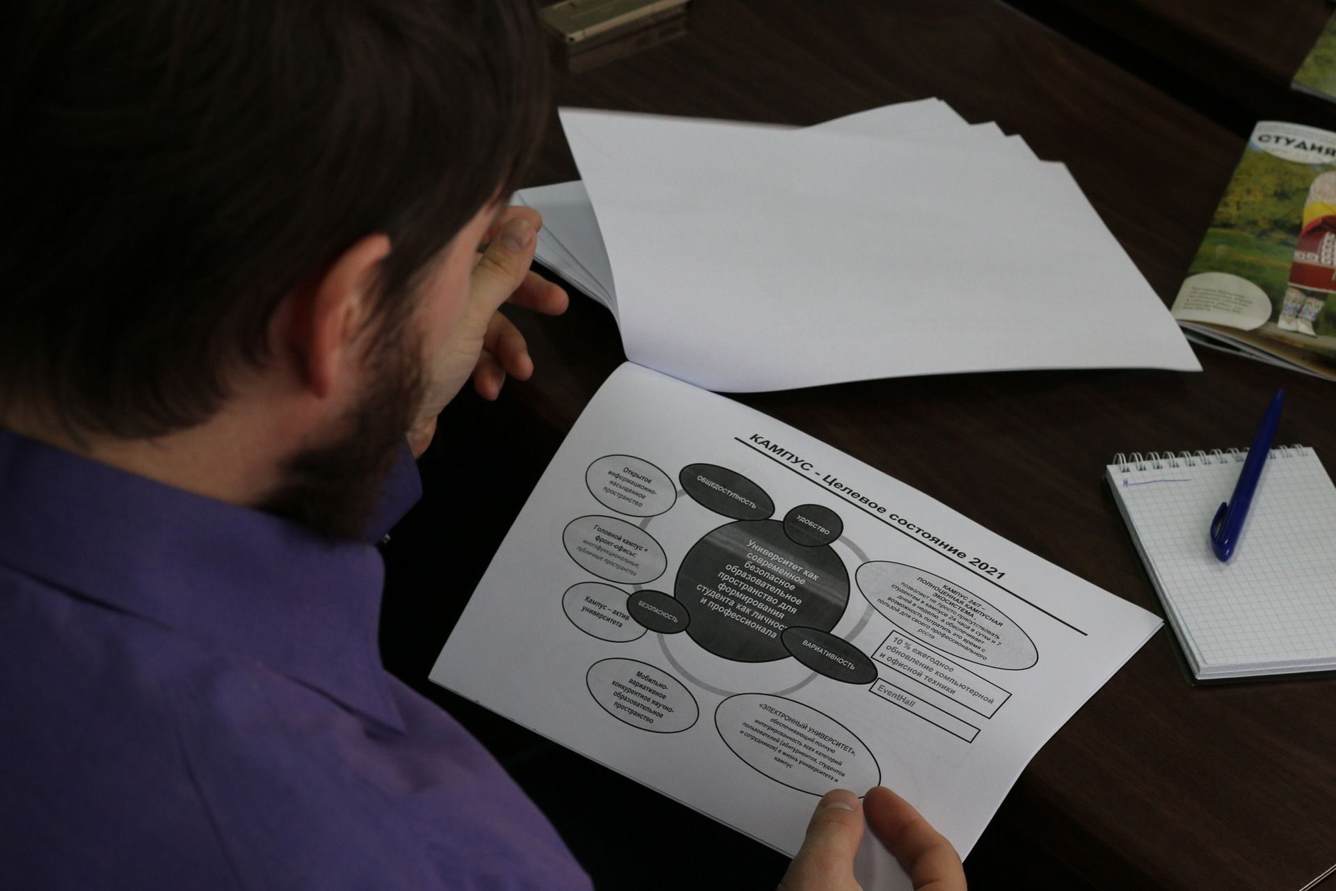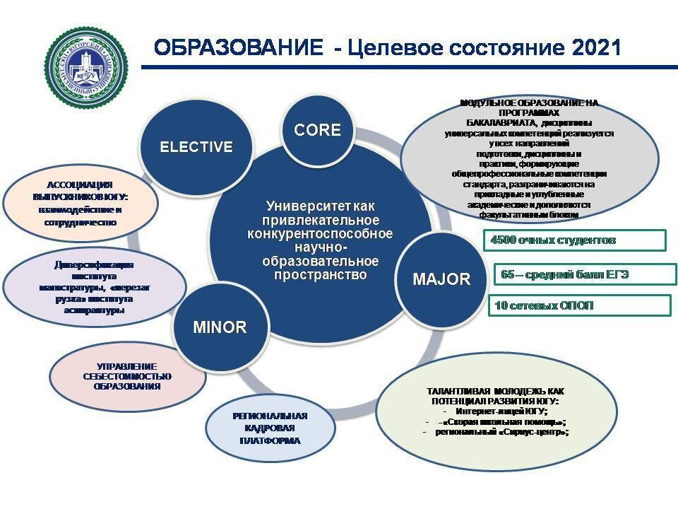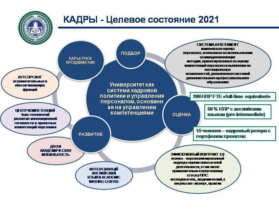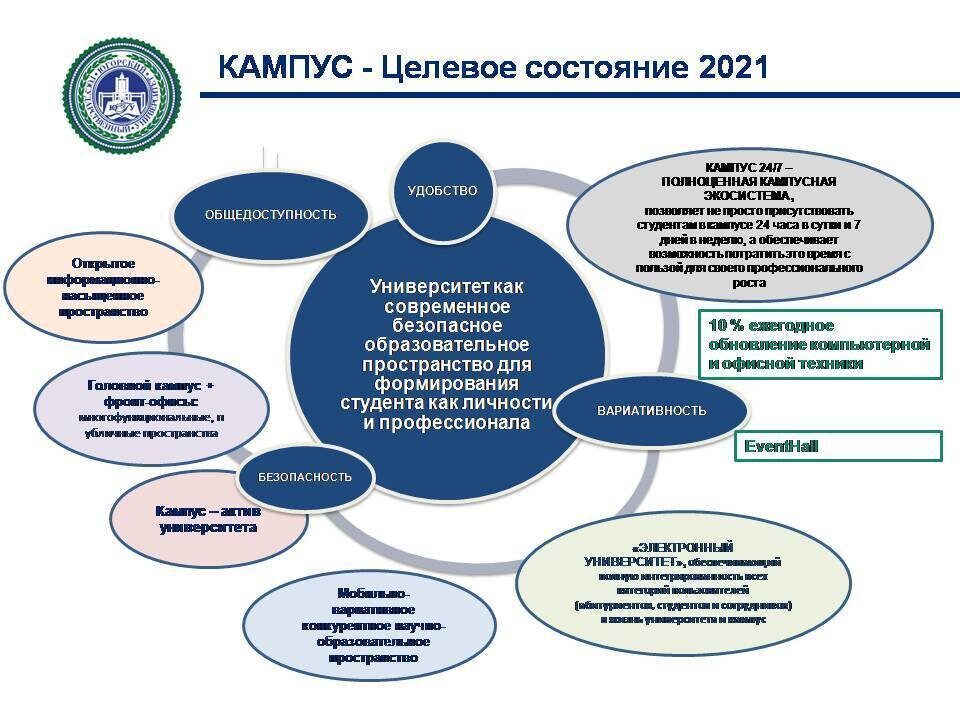 Представление Программы прошло в форме презентации. Каждый слайд отображал одно из семи направлений развития вуза: Образование, Наука, Инновации, социальная активность, Кадры, Кампус и Управление.