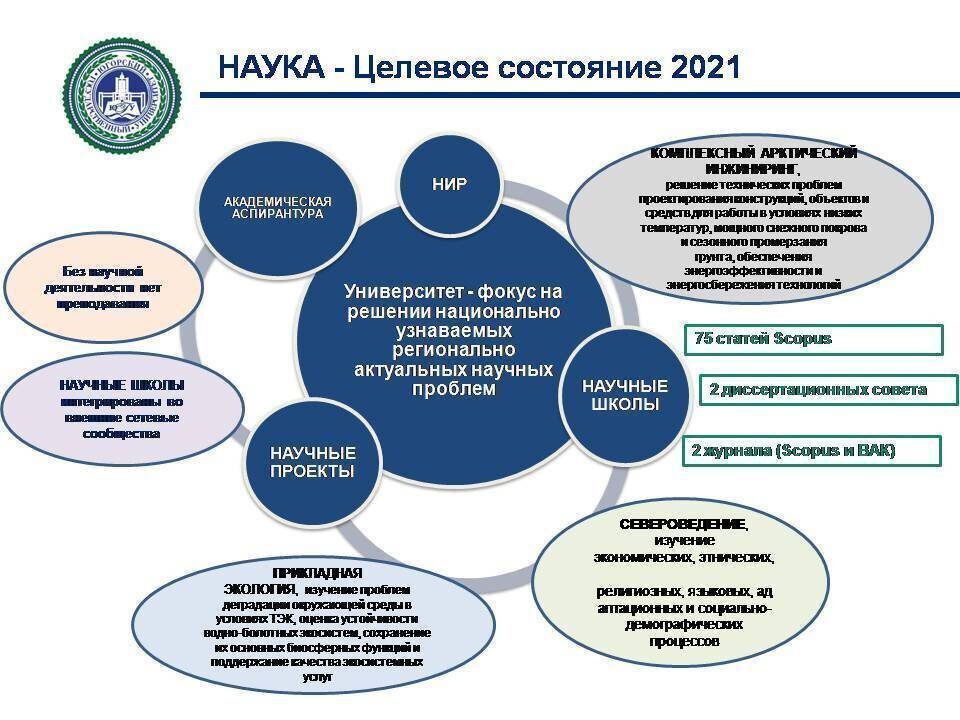 Стратегическая цель теперь будет звучать так: «Становление университета как конкурентоспособного научно-образовательного, экспертно-аналитического и социокультурного центра, интегрированного в сетевые академические структуры национального и международного уровней и систему регионального корпоративного партнерства, по направлениям: комплексный арктический инжиниринг, прикладная экология и североведение».