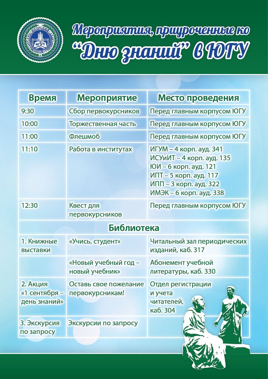 После торжественной части в учебных частях пройдут встречи студентов с директорами институтов. Затем сотрудники Волонтерского центра ЮГУ пригласят новоиспеченных студентов на ознакомительный квест-игру.