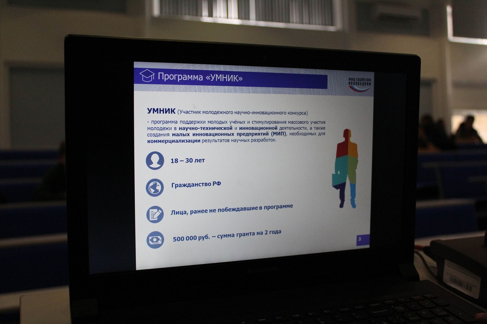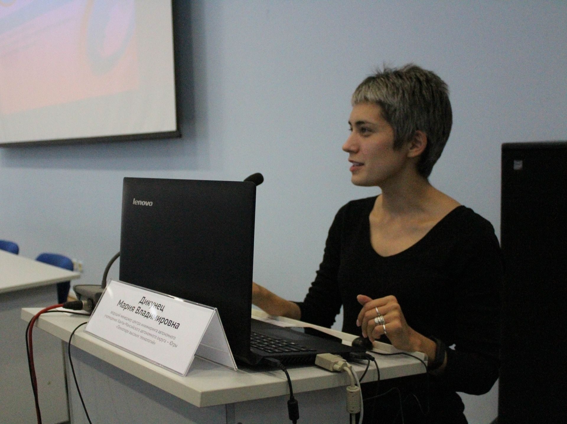 Ведущий менеджер регионального центра инжиниринга Технопарка высоких технологий Мария Дикунец рассказала студентам о программах поддержки инновационных проектов Фонда содействия развитию малых форм предприятий в научно-технической сфере. Большое внимание Мария уделила программе поддержки молодых учёных и стимулирования массового участия молодежи в научно-технической и инновационной деятельности, а также создания малых инновационных предприятий (МИП), необходимых для коммерциализации результатов научных разработок.