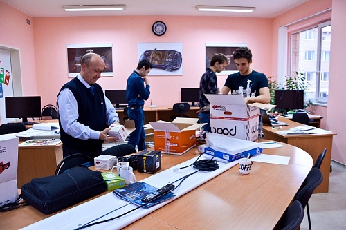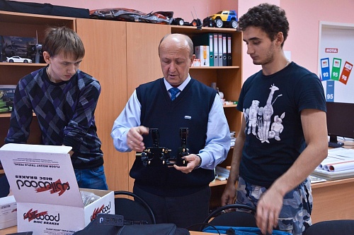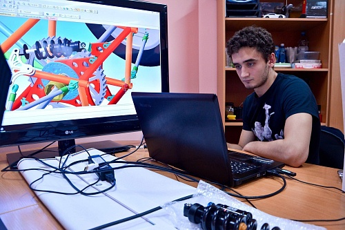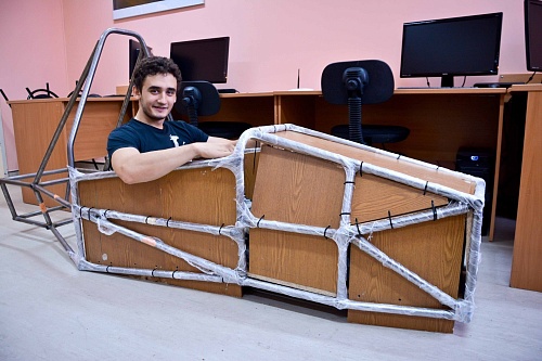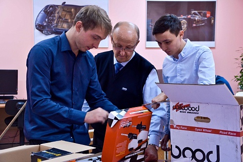 Так, едва раскрыв посылку, студенты на глаз примерили будущему болиду быстросъемный руль, педали, тормозные суппорта и другие запчасти. Всего посылка обеспечила деталями сразу пару систем автомобиля, тормозную и систему управления. Следующим шагом станет изготовление аэродинамического обвеса. Именно поэтому сейчас железный каркас «украшен» деревянными заготовками и стоит в ожидании внешней обшивки.