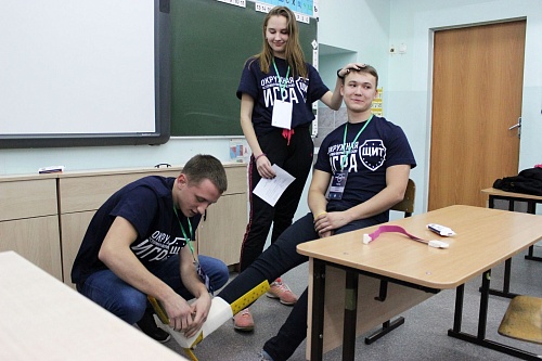 Оказание первой медицинской помощи. Здесь участники бинтовали и спасали своих товарищей по команде, Шебанова Екатерина была признана лучшей в области медицины и награждена специальным призом.