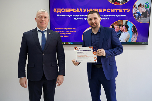 С 2023 года в ЮГУ реализуется программа «Обучение служением». Это уникальный образовательный подход, благодаря которому студенты и школьники реализуют проекты по решению реальных общественно значимых задач совместно с НКО, государством и бизнесом в рамках учебного процесса.