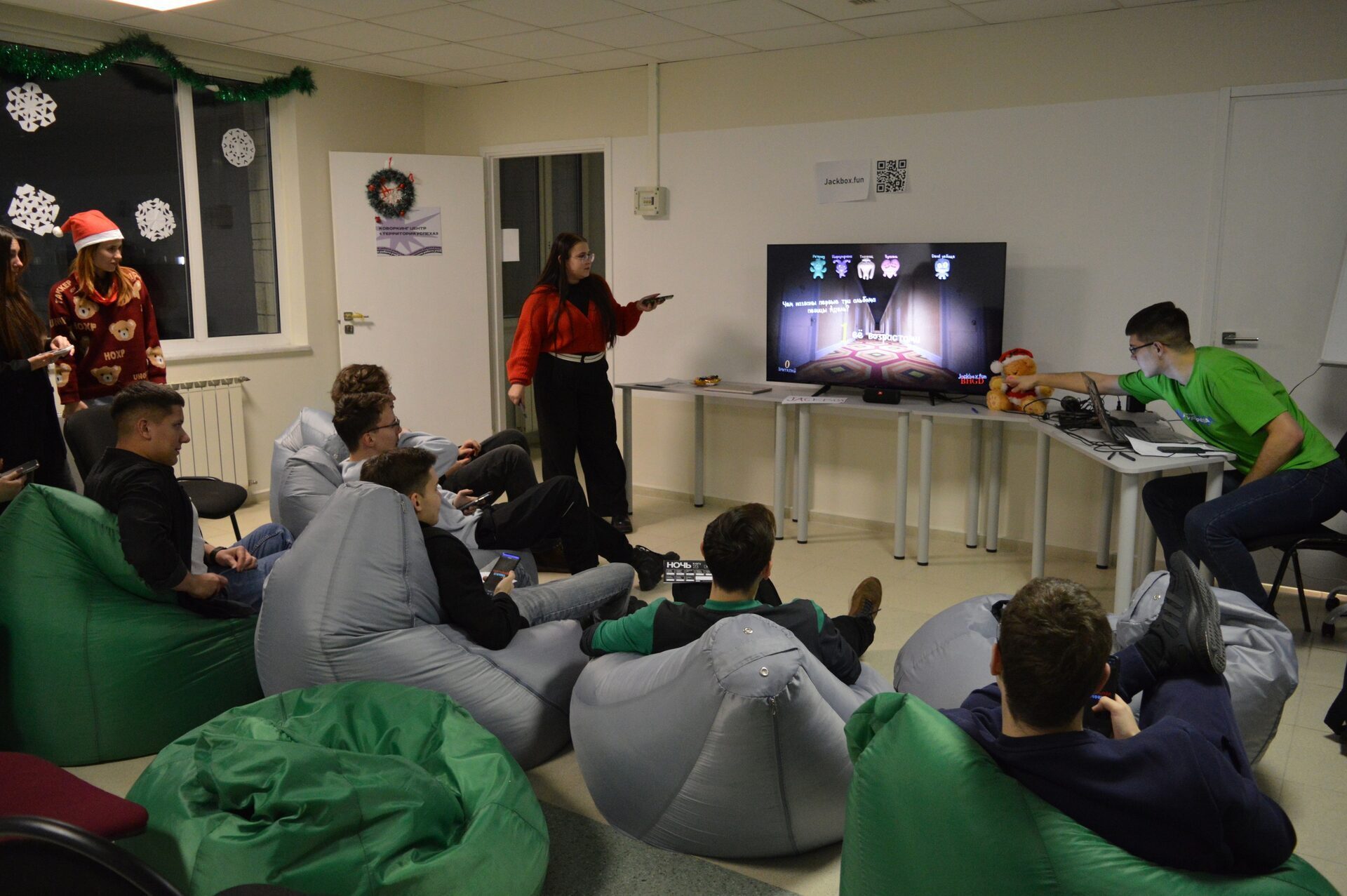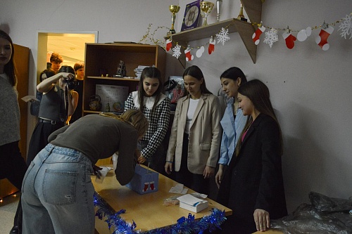 У самого входа в аудиторию развешан серебристый дождик. Несмотря на то, что до собрания еще десять минут, зал полностью переполнен, на задних рядах ребятам приходится стоять. С трудом удаётся найти свободное место. Все были одеты кто как: кто-то был в костюме белки из Ледникового периода, кто-то в новогодних шапках, а кто-то решил, что спортивок достаточно.