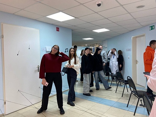 Выйдя из кабинета, мы оказались в коридоре первого корпуса, где нас ждало следующее испытание — «Нотный стан». Здесь участники должны были пройти по коридору, не задев препятствия в виде верёвок. Но условия не так уж и просты. Школьники должны спеть песню, которая начинается на первую букву их имени и могут двигаться только в момент, пока играет эта песня, а если верёвка будет задета, то все начинают путь сначала. Не всё идёт гладко: иногда не удаётся быстро вспомнить нужную песню, от волнения ребята задевают препятствия, однако терпение и собранность помогают им справиться с заданием. Победители получили подарки - шопперы, браслеты, блокноты и другие мелочи. Настроение заметно улучшилось, а волонтеры уже повели нас дальше.