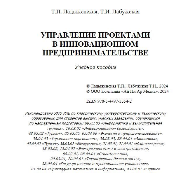 Как создать успешный стартап и собственный бизнес? А ещё как управлять проектами и продвигать продукты в инновационном предпринимательстве, как организовывать финансовое планирование? Об этом и многом другом идёт речь в новой книге доцентов Высшей школы цифровой экономики ЮГУ Татьяны Ладыженской и Татьяны Лабужской - «Управление проектами в инновационном предпринимательстве». Учебной пособие сотрудников университета выпустило издательство «Ай Пи Ар Медиа».