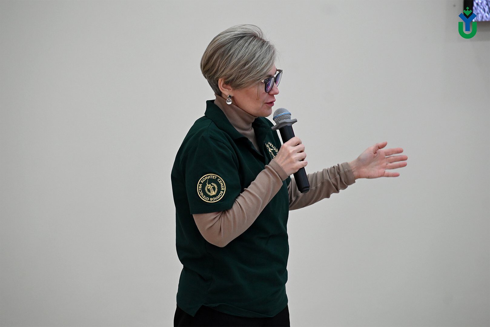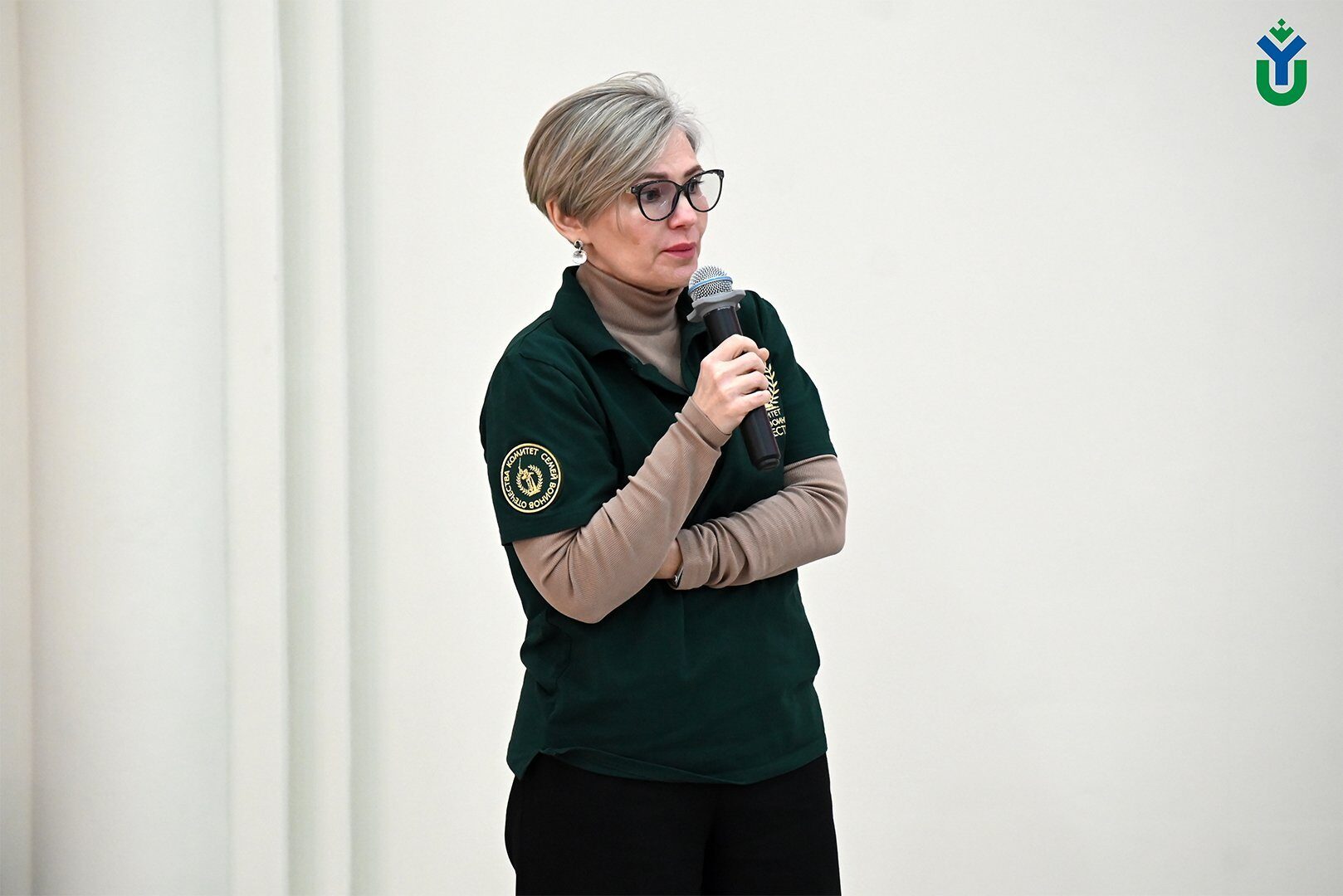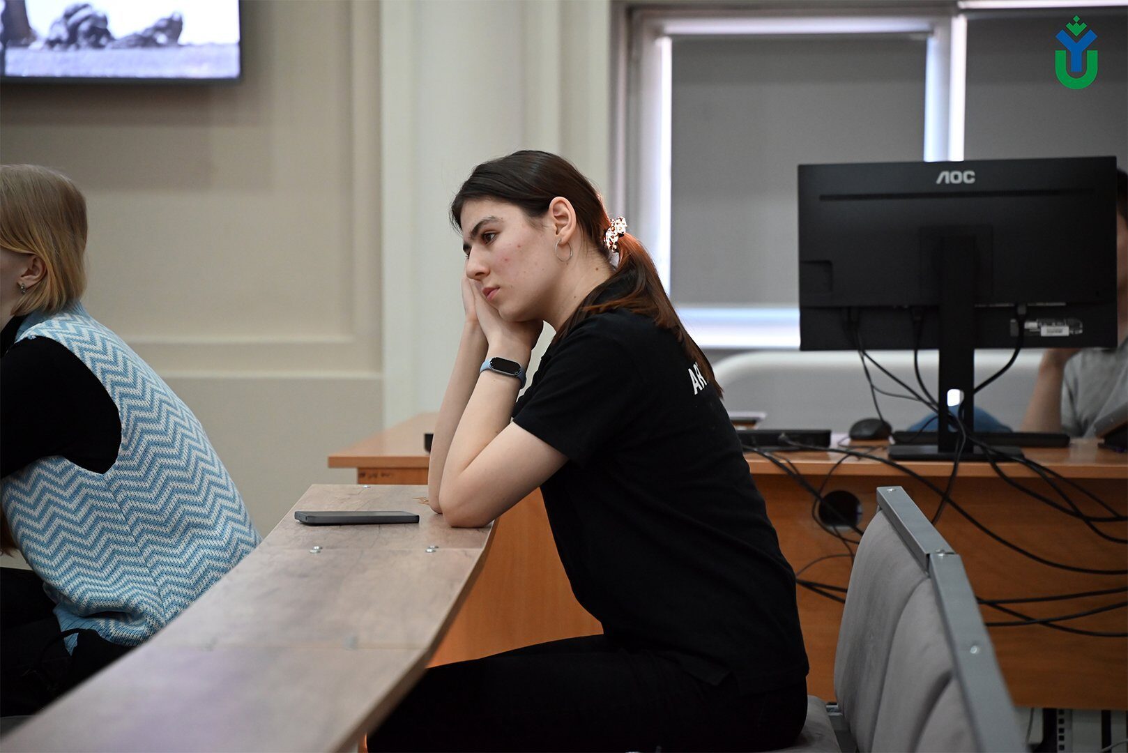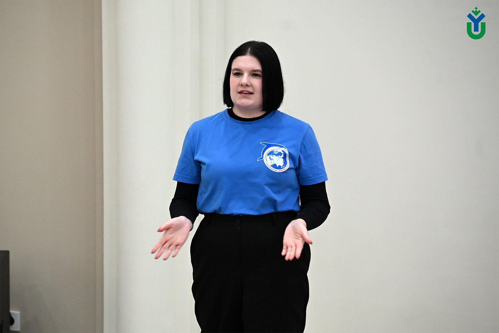 Елена Демина познакомила студентов с деятельностью Комитета семей воинов Отечества г. Ханты-Мансийска. Она отметила, что добровольчество – это зов души и рассказала о помощи в розыске пропавших без вести, а также о поддержке семей участников СВО, подчеркнув значимость этой работы для поддержания морального духа и сплоченности общества.