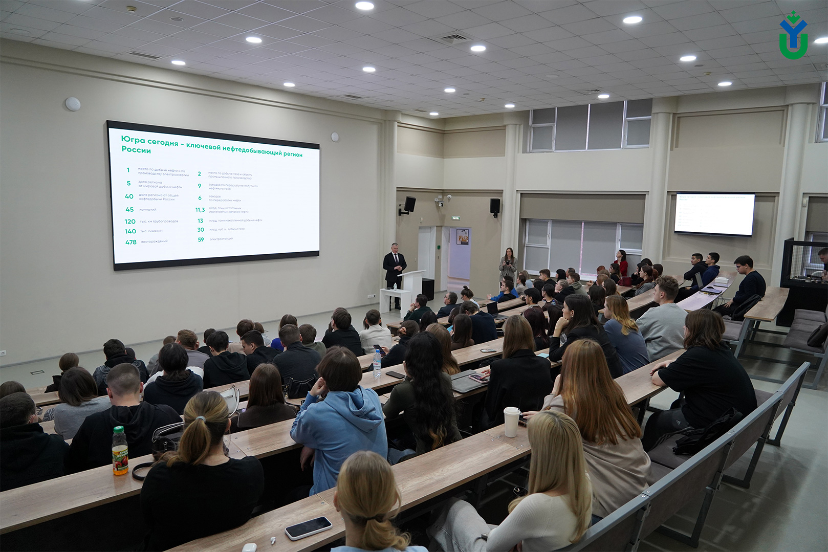 Лектор рассказал студентам и о масштабном проекте, который реализуется у в вузе при поддержке региона – «КАРБОН ДАТА ЦЕНТР». Этот масштабный региональный проект реализуется в Югре, начиная с 2022, и развивается при поддержке Минобрнауки России, правительства Югры, активному включению в него ведущих промышленных компаний региона, таких как «Салым Петролеум Девелопмент», «ЮТЭК-РС», «Газпромнефть» и других.