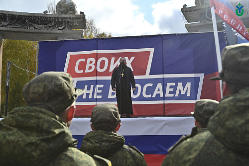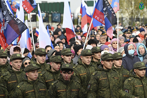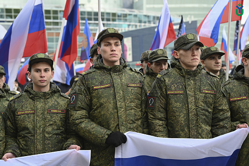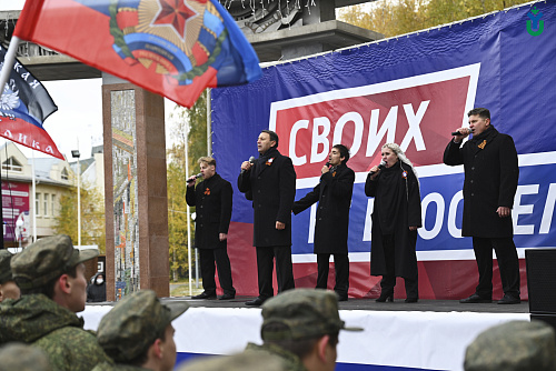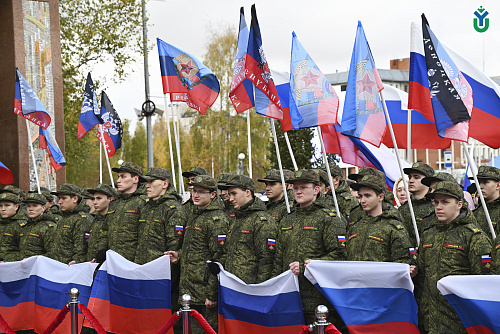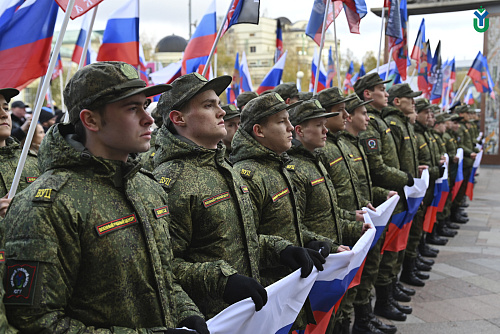 250 сотрудников и студентов сегодня приняли участие в митинге в поддержку Президента Российской Федерации и проводимой специальной военной операции на территории Украины. В первых рядах с флагами расположились курсанты Военного учебного центра.