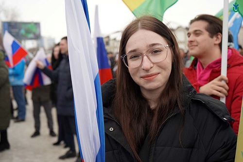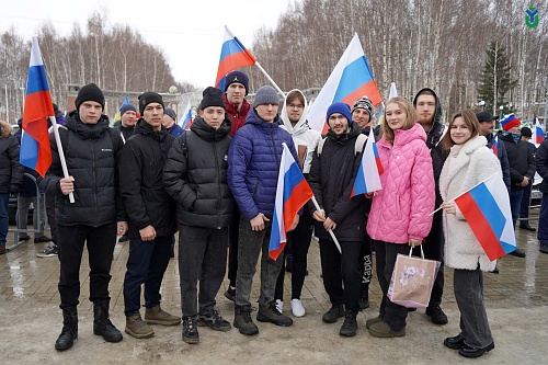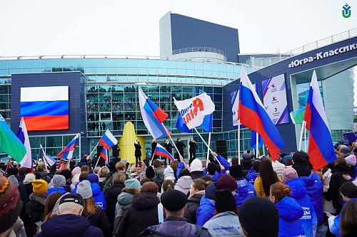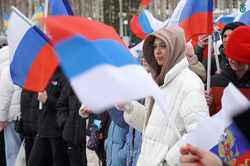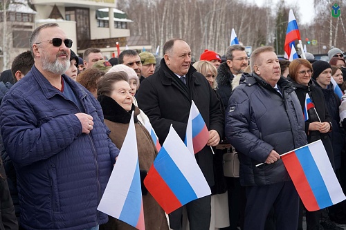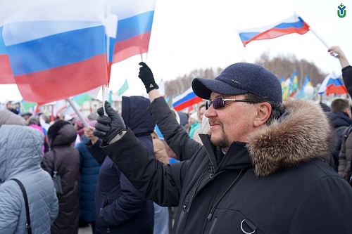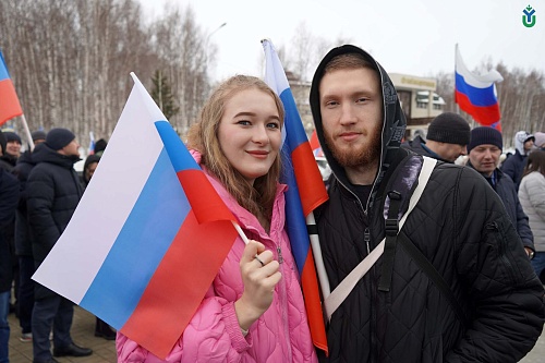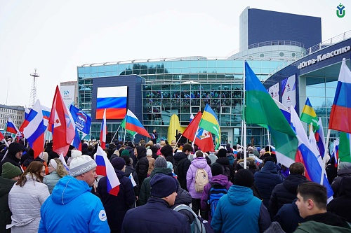 Сегодня в Ханты-Мансийске состоялся митинг-концерт «Крымская весна», посвященный 10-летию воссоединения республики Крым и города федерального значения Севастополя с Российской Федерацией. Поддержали митинг-концерт сотрудники и студенты ЮГУ.