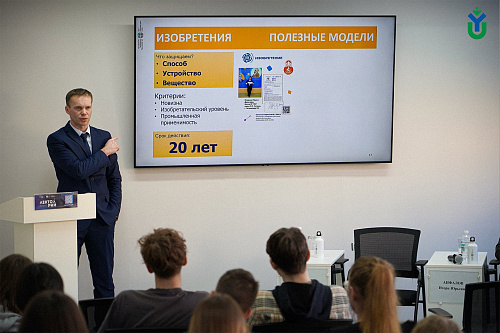 Евгений Игоревич рассказал студентам про удачные кейсы югорчан, которые зарегистрировали интеллектуальные права. Так, резиденты Технопарка патентуют дизайн машины, чума, мамонтёнка, изделия для производства сыра, принтеры.