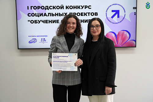 - За наставничество при организации проектной работы со школьниками и подготовку к участию в I городском конкурсе социальных проектов «Обучение служением» среди учащихся 8-11 классов школ города Ханты-Мансийск, направленном на знакомство с федеральной просветительской программой «Обучение служением.Первые», благодарственные письма вручили студентам ЮГУ: Яне Толстых, Яне Убайдуллаевой, Ксении Скрылевой, Дарье Кокориной и Чарос Абдусаматовой.