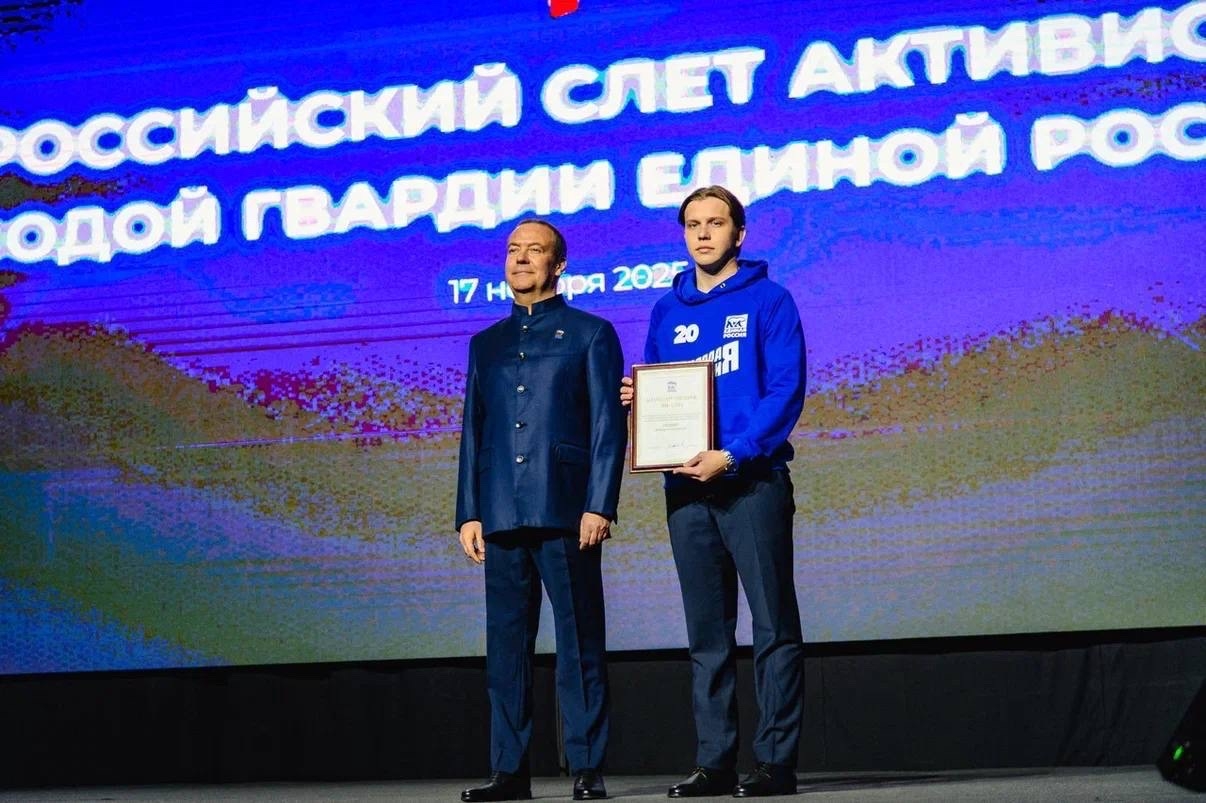 На всероссийском слете активистов в Москве, посвященному 20-летию «Молодой Гвардии», Председатель Всероссийский политической партии «Единая Россия» Дмитрий Медведев наградил благодарственным письмом выпускника Югорского государственного университета по направлению «Юриспруденция», руководителя регионального отделения «Молодой Гвардии» Данила Гордеева. Эта награда стала символом признания значительного вклада молодогвардейца в развитие региона и страны в целом.