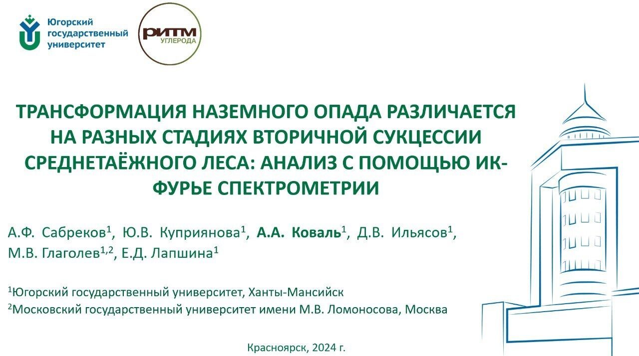 Молодой учёный ЮГУ представила доклад, подготовленный научным коллективом университета, на тему «Трансформация наземного опада различается на разных стадиях вторичной сукцессии среднетаёжного леса: анализ с помощью ИК - Фурье спектрометрии» на секции «Пожары в лесных экосистемах». Исследователи отмечают, что ИК Фурье - спектрометрия — быстрый и недорогой способ анализа трансформации химического состава подстилки на разных стадиях сукцессии (это последовательная закономерная смена одного биологического сообщества другим на определённом участке среды во времени в результате влияния природных факторов или воздействия человека).