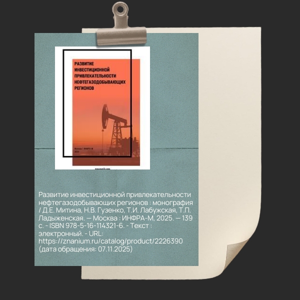сайте ЭБС Znanium вышла монография преподавателей ЮГУ «Развитие инвестиционной привлекательности нефтегазодобывающих регионов». Авторы книги – доценты Высшей школы цифровой экономики ЮГУ Митина Дина, Лабужская Татьяна, Ладыженская Татьяна и Гузенко Наталья.