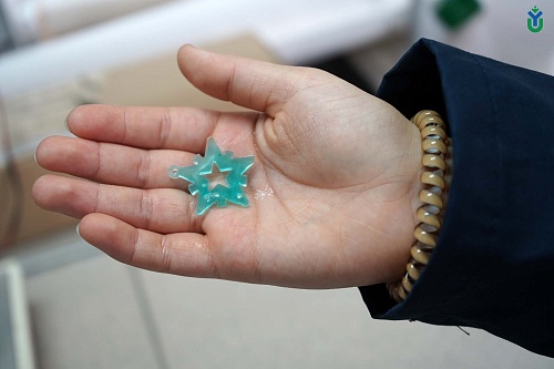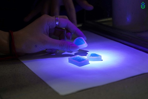 «Мы возьмем эпоксидную смолу, зальем в формочки, поставим их под ультрафиолет и наш олигомер – смола – затвердеет и превратится в полимер. Из эпоксидной смолы делают различные изделия – часы, панно, картины», - рассказала учащимся лаборант химической лаборатории, магистрант ЮГУ Алина Савченко. Добавим, что каждый школьник ушёл из лаборатории со своим сувениром из эпоксидной смолы.