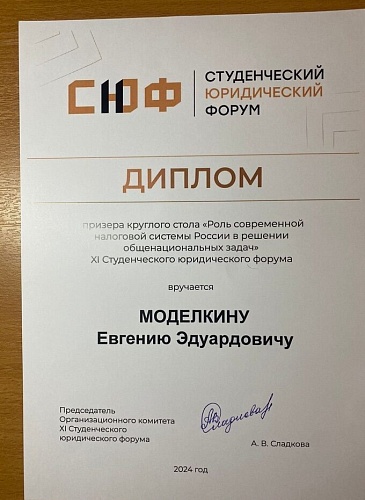 По результатам круглого стола Евгений стал призером круглого стола XI Студенческого юридического форума. Поздравляем его с высоким результатом и желаем ему дальнейших научных достижений!