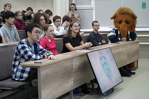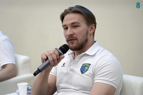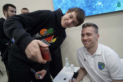 Студенты ЮГУ встретились с игроками ХК «Югра» - защитником Максимом Афанасьевым, нападающим Владиславом Шутовым и вратарём Владиславом Сухачёвым.