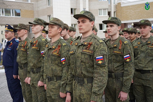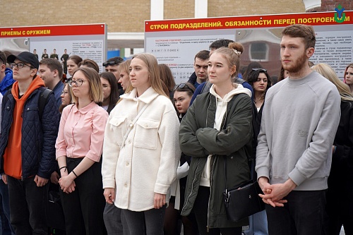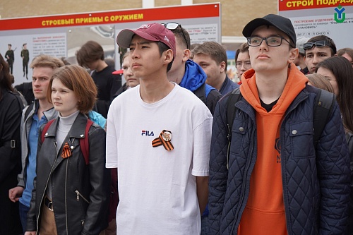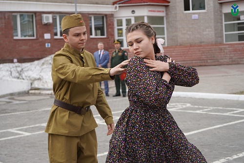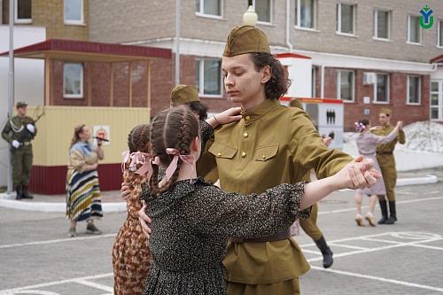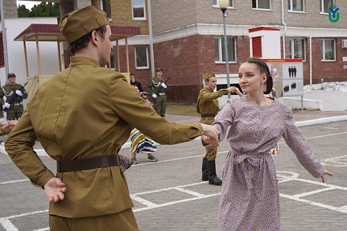 Во внутреннем дворе под звучание песен военных лет выстроились курсанты Военного учебного центра, студенты и преподаватели. Участниками мероприятия также стали представители проректорского состава вуза.