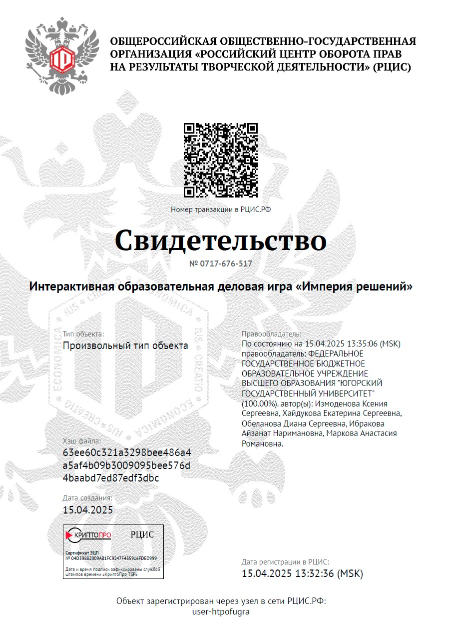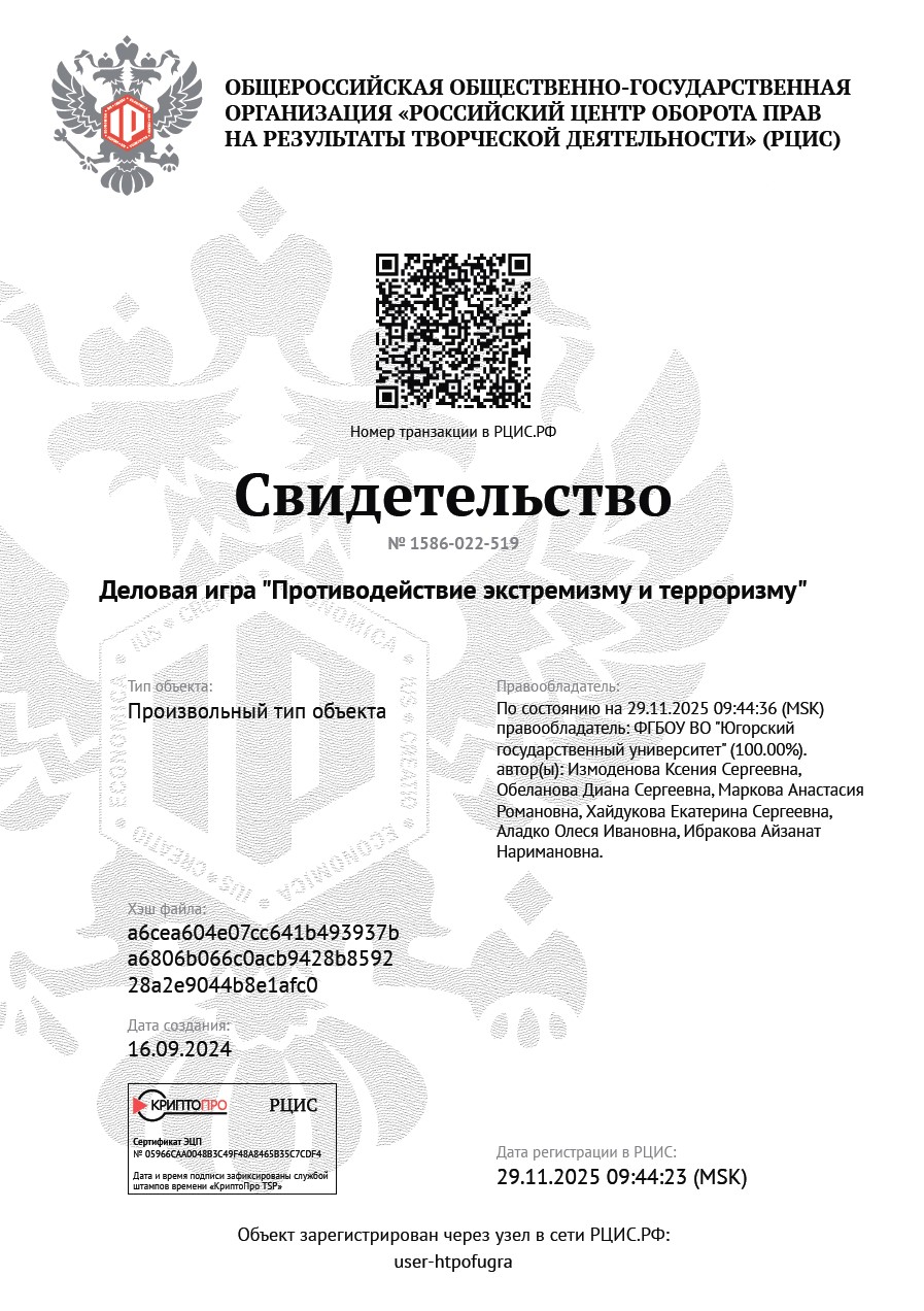 Разработки проходят процедуру депонирования через Сервис цифрового депонирования n’RIS (РЦИС). Правообладателем является Югорский государственный университет.